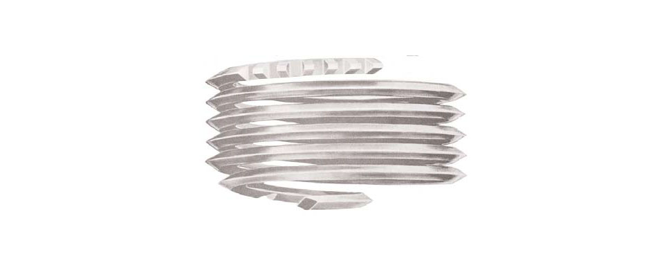Heli-Coil spark plug screw thread inserts are manufactured from 18-8 round stainless steel wire formed into a 60° diamond-shaped wire. This cold-worked wire, which has a tensile strength of 200,000 PSI, is wound into a helical coil with a driving tang and notch to remove the tang after the insert is screwed into the Heli-Coil® tapped hole.